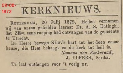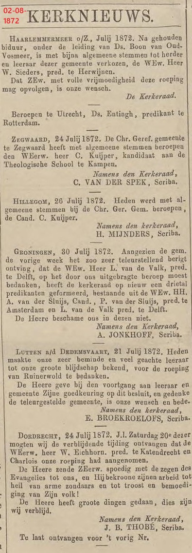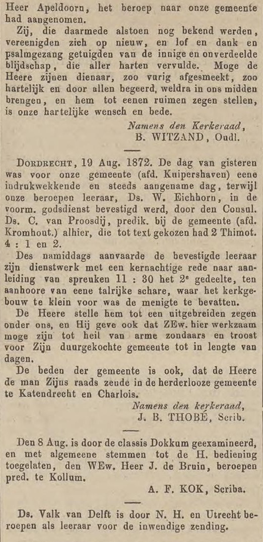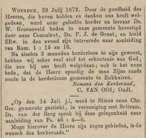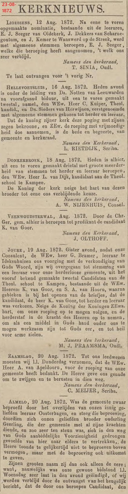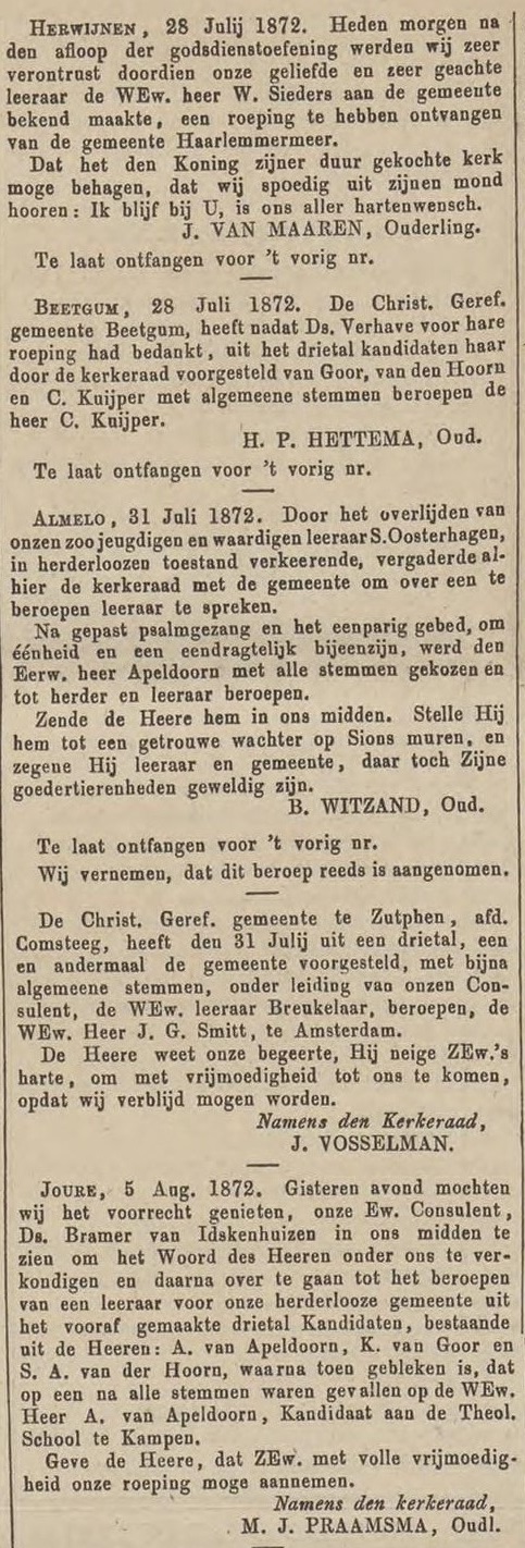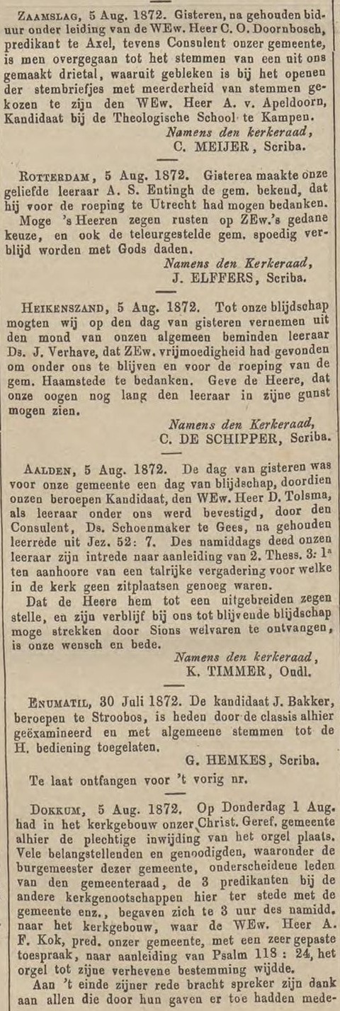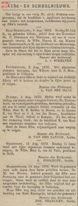 ( < Naar deel 64 – Back to Part 64 ) – De Bazuin was jarenlang het landelijke kerkblad dat ten voordele van de Theologische School te Kampen werd uitgegeven. Deze keer nemen we daaruit enkele berichten over uit de maand augustus 1872, die betrekking hebben op plaatselijke Christelijke Gereformeerde Gemeenten.
