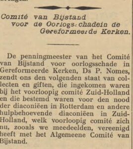 Daarom vonden de Deputaten dat die taak moest worden overgenomen door een speciaal daarvoor opgericht kerkelijk comité. Vandaar dat overleg gepleegd was met de preses van de synode, ds. F.C. Meyster (1881-1959) van Rotterdam. Besloten was dat ‘vanuit de kerken’ een ‘Comité van Bijstand’ gevormd zou worden, ‘bestaande uit leidende personen in de provincies’. Het bestuur zou bestaan uit dr. H.H. Kuyper (preses), ds. J. Attema (1900-1956), scriba, en ds. P. Nomes (1887-1967), penningmeester. Zodra de ‘Commissie Oorlogsschade’ (ook Comité Bijstand genoemd) volledig bemand was zouden de namen worden gepubliceerd.