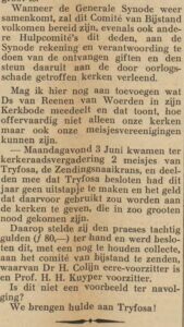 The girls’ society Tryfosa in Woerden also got involved in helping the victims of the bombings. Rev. C. van Reenen (1888–1976) of Woerden reported that on Monday evening, June 3, 1940, two girls from Tryfosa, the church’s missionary sewing circle, attended the church council meeting and announced that Tryfosa had decided not to go on an outing that year, and instead would use the saved money “to give to the Churches that have fallen into such great need.” They donated fl. 80.