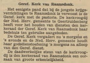 There were other objections as well. For example, the editor-in-chief of the ‘gereformeerde’ weekly De Wachter, which positioned itself as a loyal supporter of the Secessionist tradition within the ‘Gereformeerde’ Churches, felt that reports from the War Damage Committee should not be communicated through the (originally Doleantie-aligned) weekly De Heraut of Dr. Kuyper, but through De Bazuin, which he considered “the official organ of the ‘Gereformeerde’ Churches.”