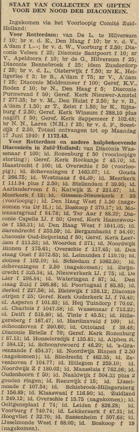 The national War Damage Committee, of course, wanted to alleviate the most severe needs, but the situation was so overwhelming that the Committee could not handle it alone. It wrote to the ‘Gereformeerde’ Churches in South Holland requesting a collection. To this end, a Provisional War Damage Committee was formed in South Holland to streamline the collections in that province, but it soon merged with the national War Damage Committee. The first contributions started to come in quickly—by June 17, 1940, nearly fl. 21,000, and less than two weeks later, the total had risen to nearly fl. 32,000. Together with other contributions, the total income amounted to fl. 70,000.