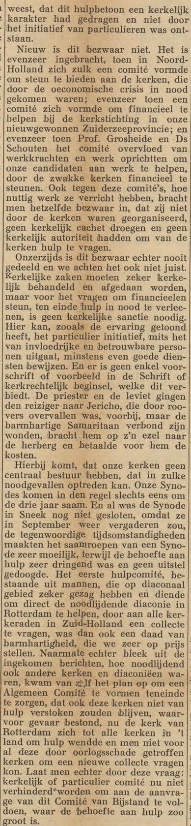 There were other objections as well. For example, the editor-in-chief of the ‘gereformeerde’ weekly De Wachter, which positioned itself as a loyal supporter of the Secessionist tradition within the ‘Gereformeerde’ Churches, felt that reports from the War Damage Committee should not be communicated through the (originally Doleantie-aligned) weekly De Heraut of Dr. Kuyper, but through De Bazuin, which he considered “the official organ of the ‘Gereformeerde’ Churches.”
