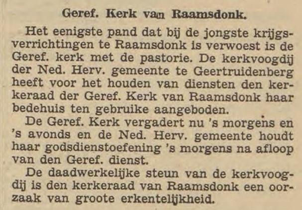 In Raamsdonksveer waren zowel de kerk als de pastorie beide totaal verwoest (de Gereformeerde Kerk kon voor haar kerkdiensten gelukkig gebruik maken van het hervormde kerkgebouw in Geertruidenberg). Maar de Deputaten voor de Correspondentie met de Hooge Overheid vermoedden dat vast en zeker ook veel schade geleden was bij de Grebbelinie en in Zeeuws-Vlaanderen, waar immers hard gevochten was.