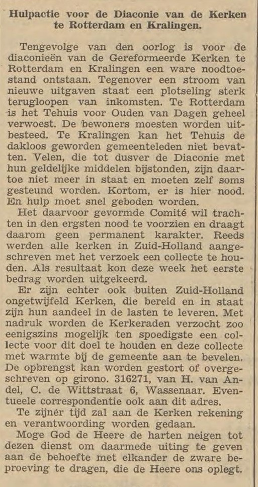 Intussen was door de oorlog voor de diaconieën van de Gereformeerde Kerken in Rotterdam (Centrum) en Kralingen een ware noodsituatie ontstaan. Tegenover een stroom van nieuwe ondersteuningsuitgaven stond een plotseling sterk teruglopen van de inkomsten. In Rotterdam werd het Tehuis voor Ouden van Dagen geheel verwoest. De bewoners ervan moesten worden overgeplaatst naar elders, maar het Tehuis in Kralingen kon de dakloos geworden gemeenteleden niet bergen. Ook waren veel gemeenteleden die in normale tijden de diaconie met hun geld steunden, daartoe niet meer in staat en moesten zelf gesteund worden!