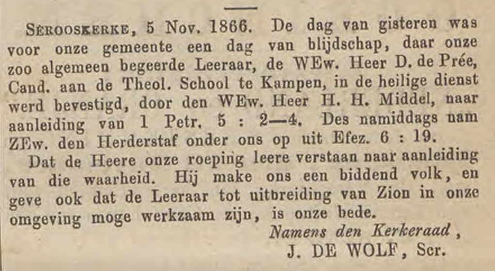 That succeeded with the arrival of the 38-year-old candidate Daniël de Pree (1832–1891), who had previously been an elder in the Seceded congregation of Sluis and had later gone to Kampen to study for the ministry. On November 4, 1866, he was ordained by Rev. H.H. Middel of Wolphaartsdijk, who preached on 1 Peter 5:2–4: