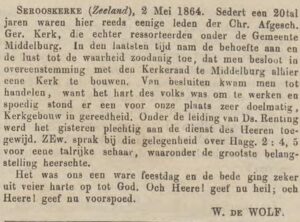 Plans slowly became reality, though it still took a few years. During the Provincial Assembly in April 1864, Rev. H. Renting (1825–1891) of Middelburg was able to announce that in Serooskerke, a separate Christian Seceded Congregation would soon be established and that an unpretentious church building was already under construction and would soon be in use. “Those present were deeply delighted.” Rev. Renting also invited the ministers to come and preach there from time to time. Present were Rev. A. de Bruijne (1810–1877) from Goes, Rev. P. den Boer (1828–1901) from Baarland, Rev. H.H. Middel (1802–1882) from Wolphaartsdijk, Rev. C. Steketee (1819–1882) from Nieuwdorp, Rev. H.A. Jonkman (1825–1898) from Zierikzee, Rev. P. Diermanse (1822–1912) from Vlissingen, and finally Rev. S.O. Los (1803–1882) from (Ter) Neuzen. They all agreed and promised “so far as it is possible for them also there to cast out the net of the Gospel.”