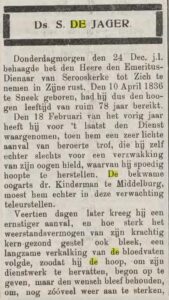 De opvolger van ds. Tobi trad al vrij snel aan. Op 7 april 1878 deed ds. S. de Jager (1836-1914) uit Murmerwoude intrede.