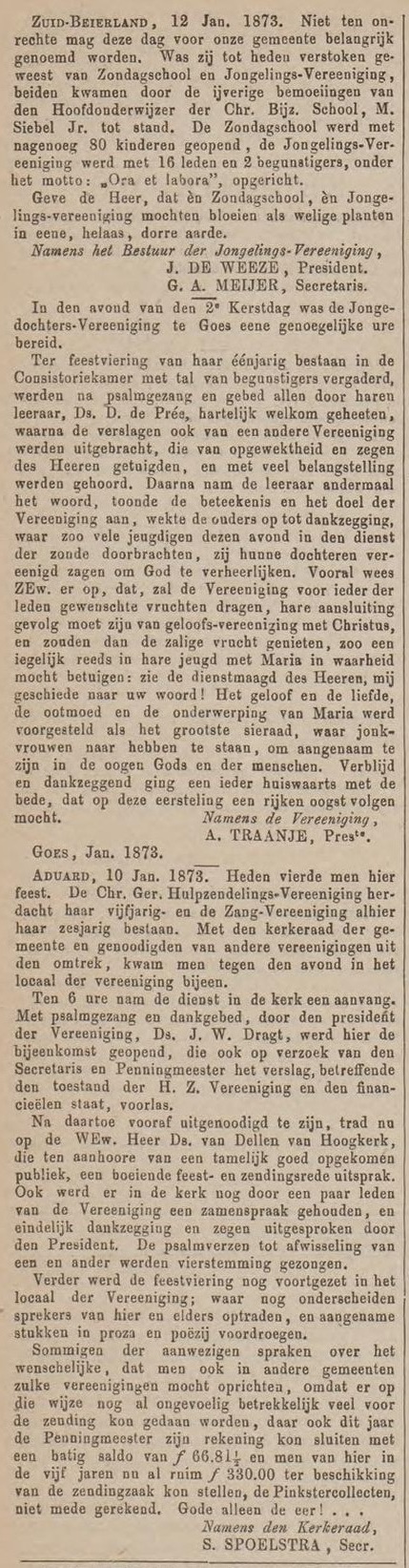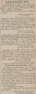 ( < Naar deel 69 – Back to Part 69 ) – De Bazuin was jarenlang het landelijke kerkblad dat ten voordele van de Theologische School te Kampen werd uitgegeven. Deze keer nemen we daaruit enkele berichten over uit de maand januari 1873, die betrekking hebben op plaatselijke Christelijke Gereformeerde Gemeenten.