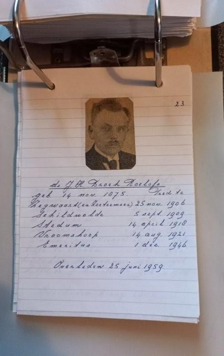 Over the years he purchased countless commemorative and anniversary books of ‘Gereformeerde’ Churches at book fairs and flea markets, often also through contacts with booksellers. These books yielded new photographs, which he usually copied and added to his archive. Later in life, he also made use of the computer to find additional photographs via websites of ‘Gereformeerde’ and PKN churches. Until about 2015 he was able to continue expanding his collection in this way. After that, his health no longer allowed him to maintain the archive — which by then consisted of some twenty systematically organized binders full of information and photographs — although he still had the information about ministers readily at hand.