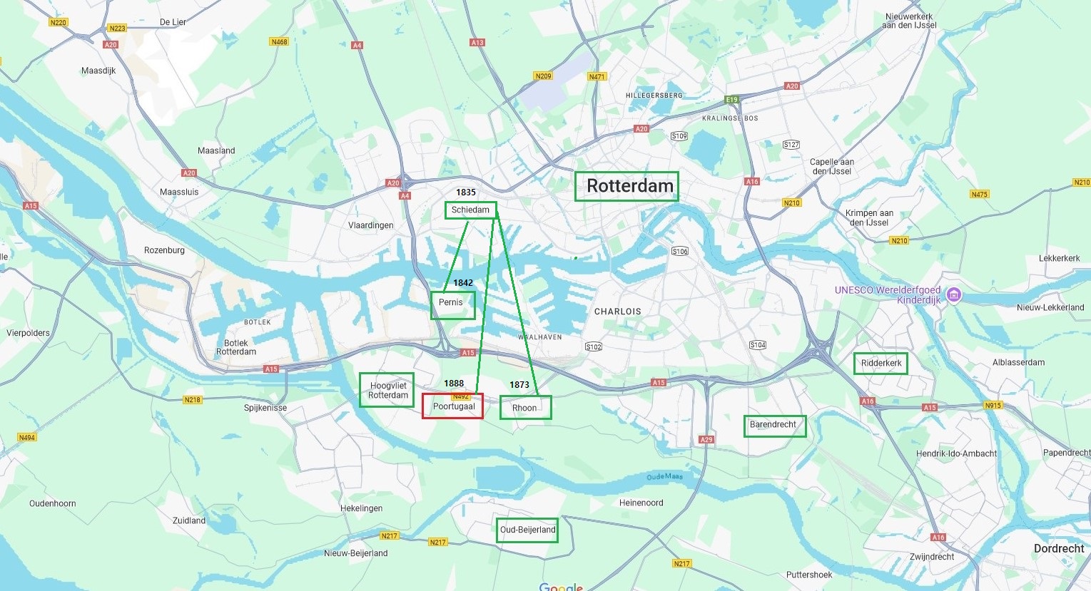In that region, congregations had already been founded much earlier—not from the Doleantie, but from the Secession of 1834. The first was that of Schiedam (in November 1835). From this Schiedam congregation came, among others: Pernis (most likely at the end of 1842), Rhoon (in 1873), and finally Poortugaal in 1888. However, this last one did not originate from the Secession of 1834, but from the Doleantie of 1886.